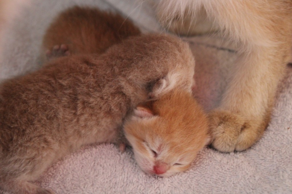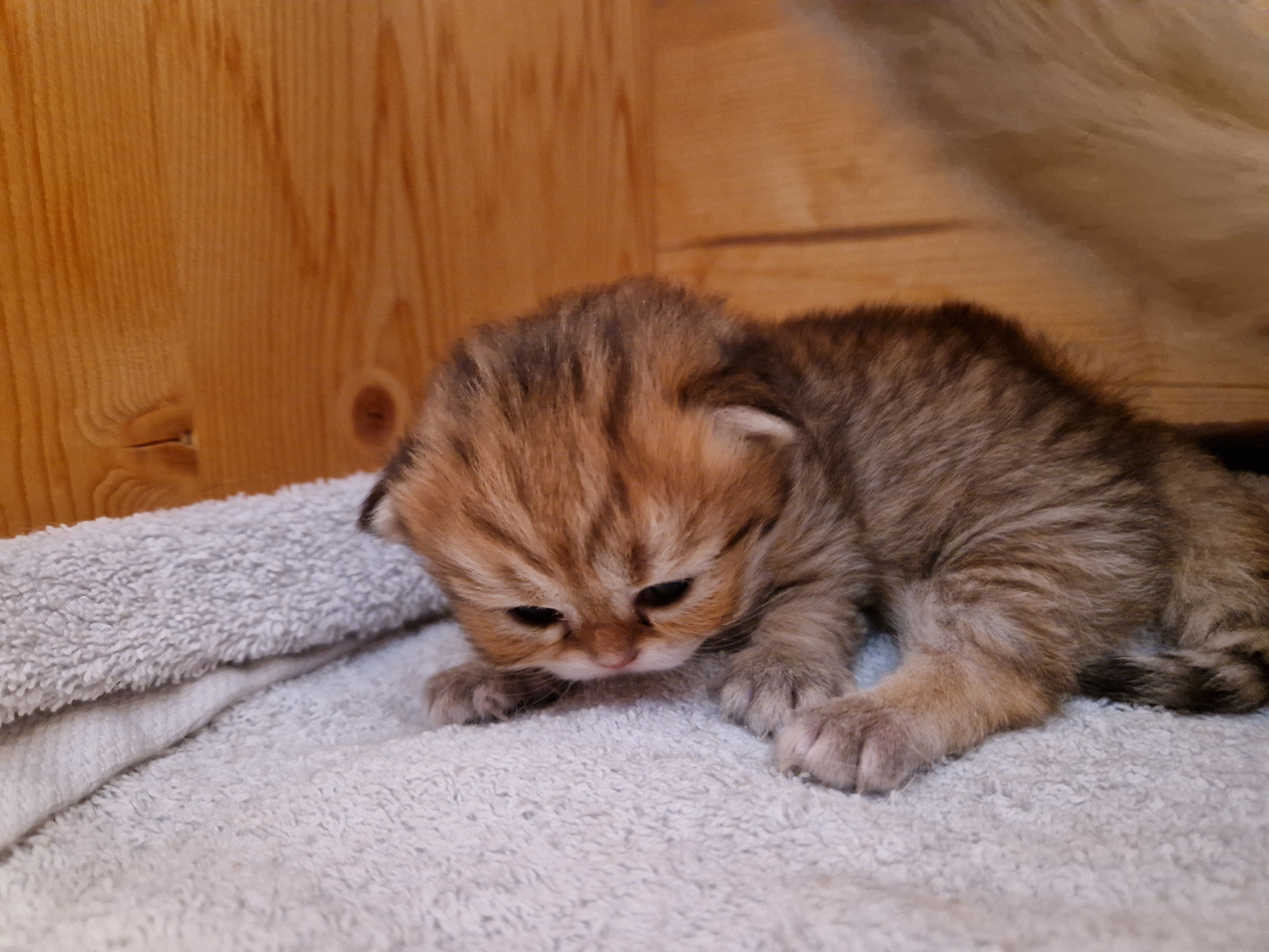 Les trois chatons grandissent, ils ont ouvert les yeux et commencent doucement à jouer.