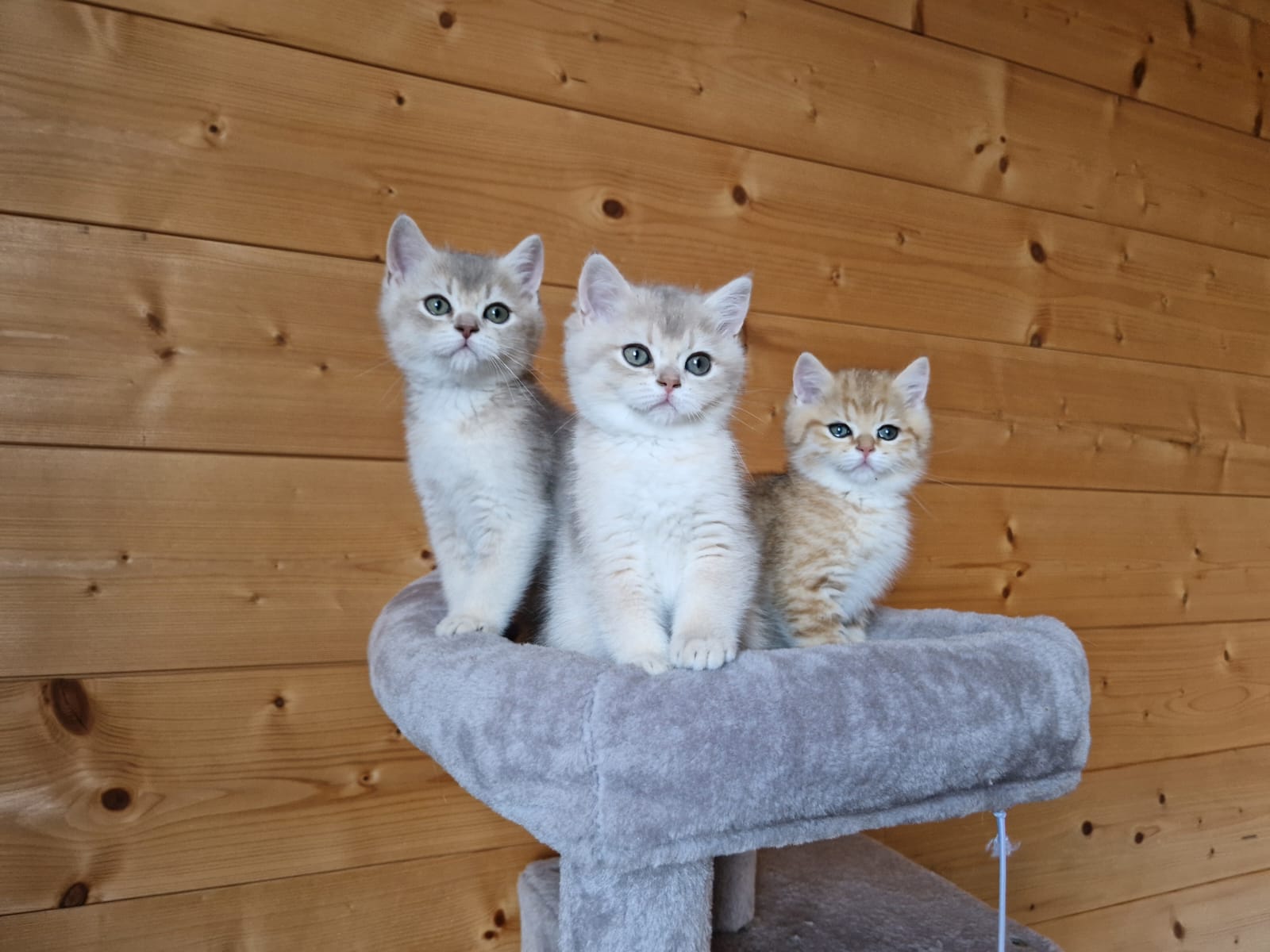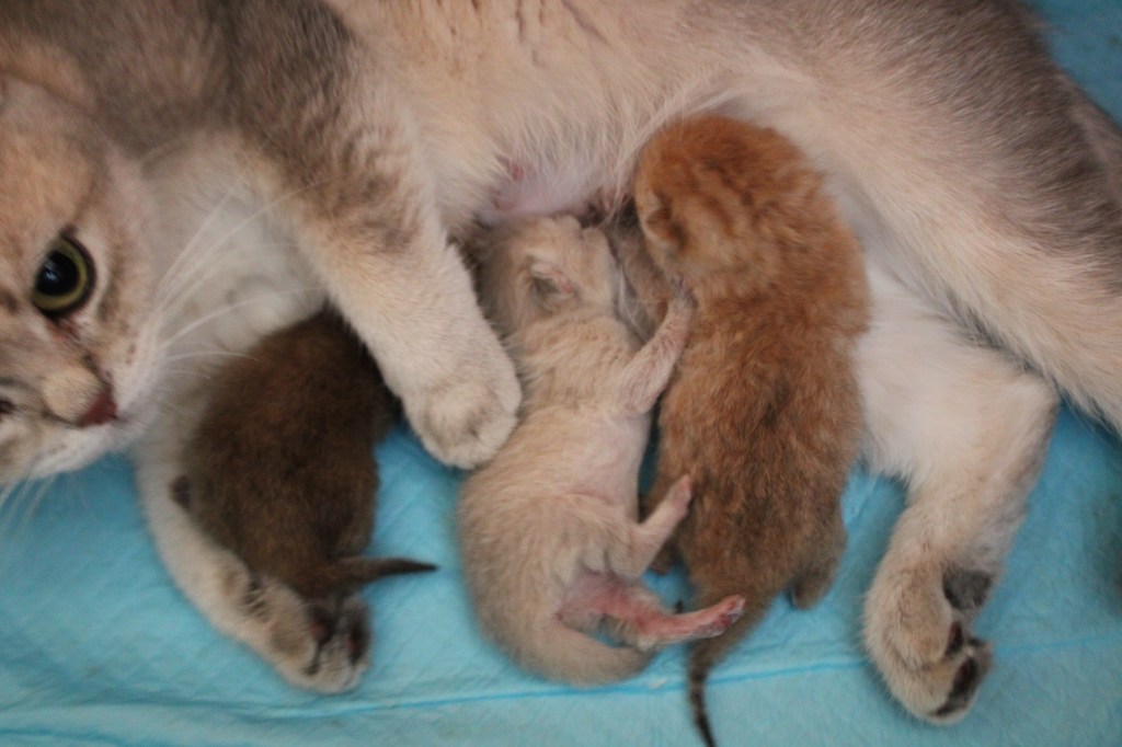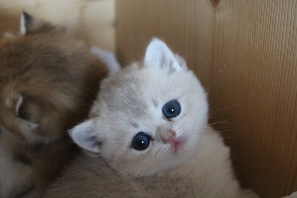 Trois petits scottish straight ont encore pointé le bout de leur nez ce dimanche soir, une jolie palette de couleur en passant du black golden shaded, au shell puis au blue golden. Unn a été très courageuse et est une maman formidable. Une portée 100% féminine.