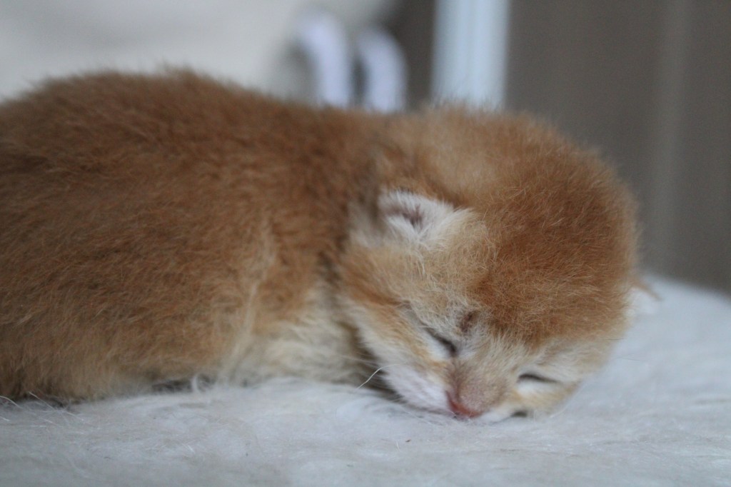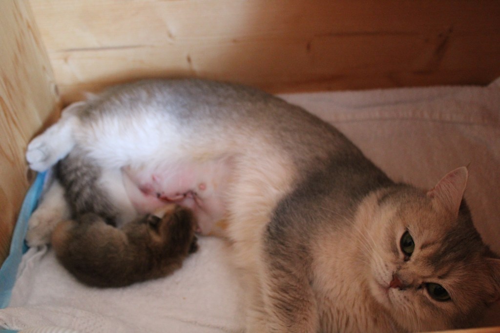 Après une mise bas un peu compliquée et quelques nuits blanches la seule chatonne de la portée de Unn a pointé le bout de son nez ce dimanche. C’est une petite scottish straight née par césarienne en urgence, mais heureusement tout se termine bien, elle profite des mamelles de sa maman pour elle toute seule et Unn se remet gentiment de son opération.