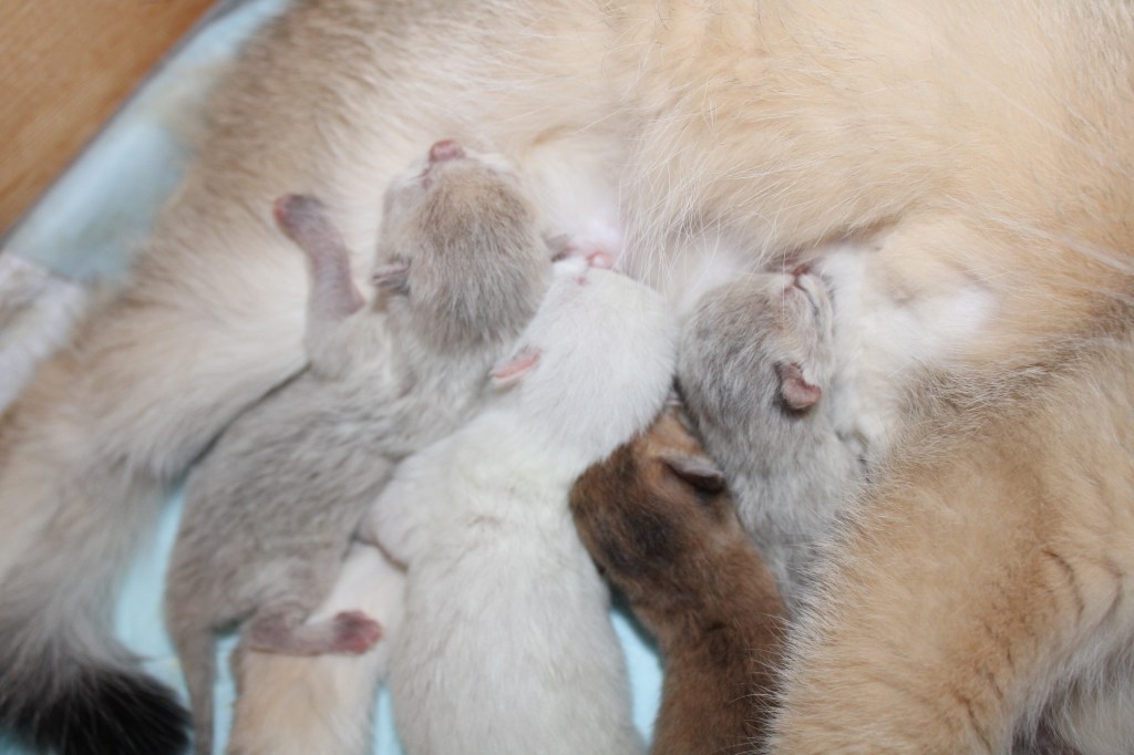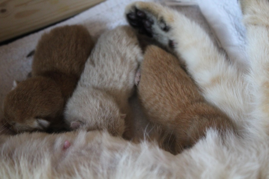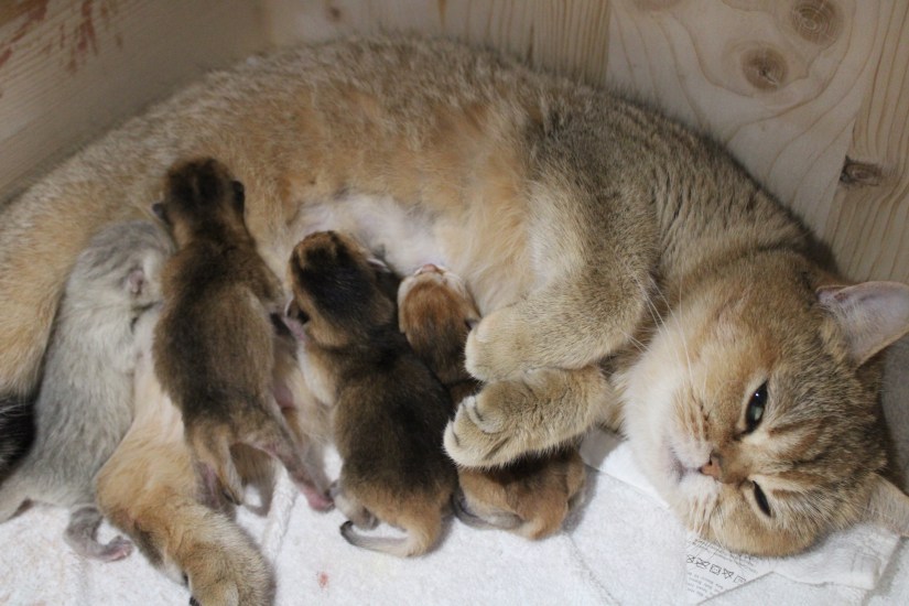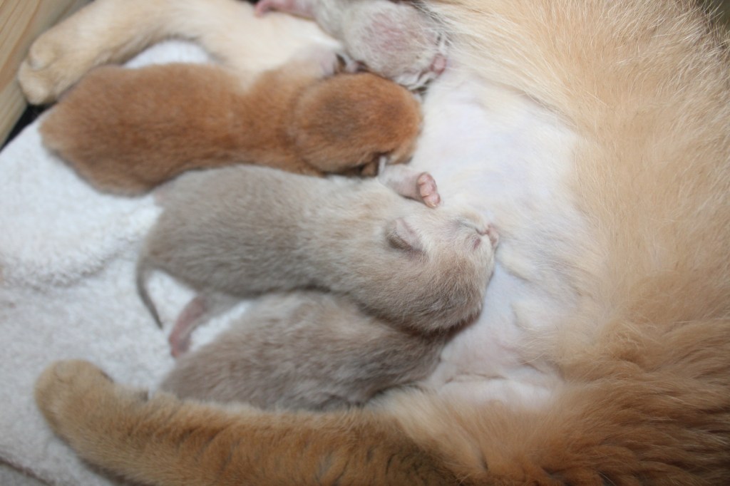 Une mise bas qui s’est plus que bien déroulée, Tess a été très courageuse en deux heures tous ses chatons étaient sortis. Des mises bas comme on les aime. Tess est pour la parité et nous a offechrt deux femelles et deux mâles.