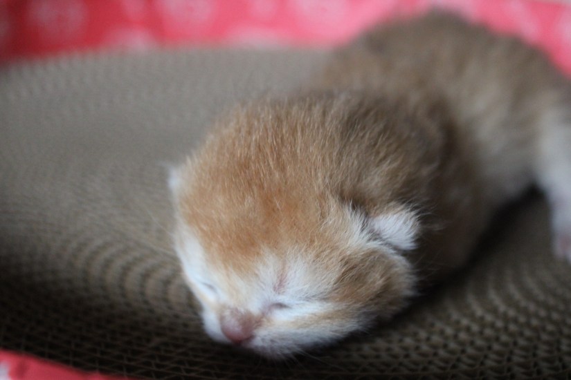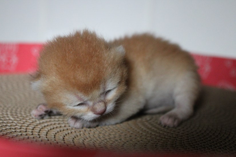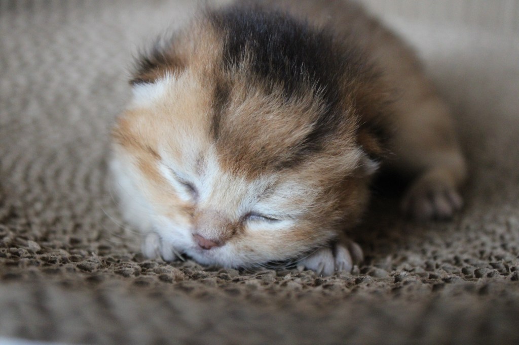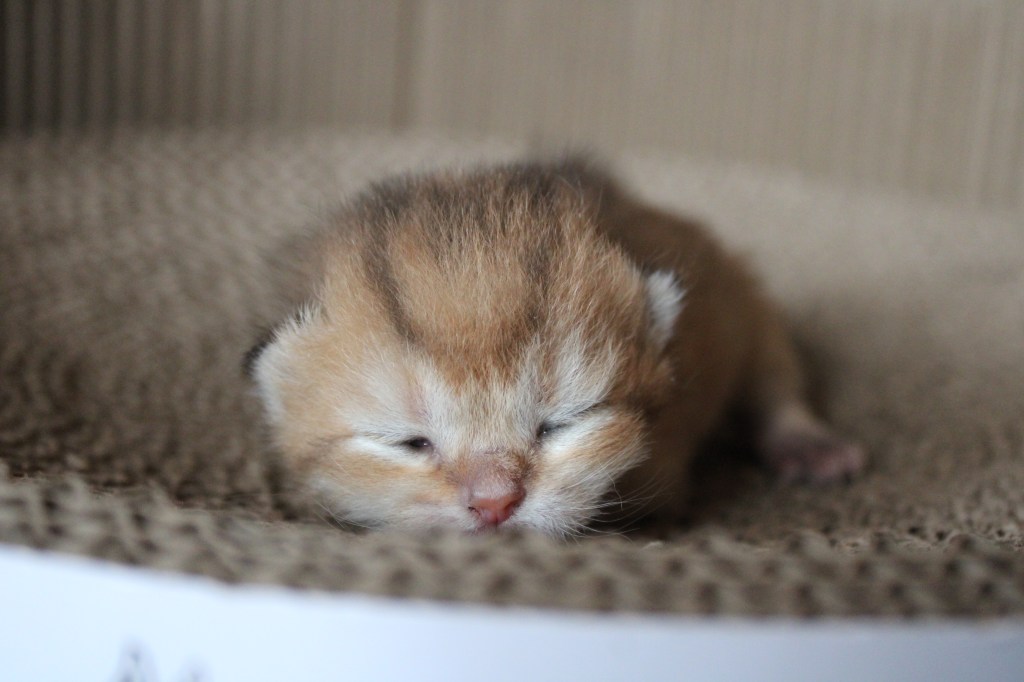 Xéna nous a fait une mise-bas éclair, en 50 min ses quatre chatons étaient dehors. Un petit chaton est arrivé à 40gr seulement en général les chatons naissent entre 70-100gr. Nous l’avons biberonné jour et nuit pour le mettre hors de danger. A J+3 il est passé à 56gr. C’est une petite victoire, nous continuons de l’aider à grandir et nous espérons qu’il s’en sortira.