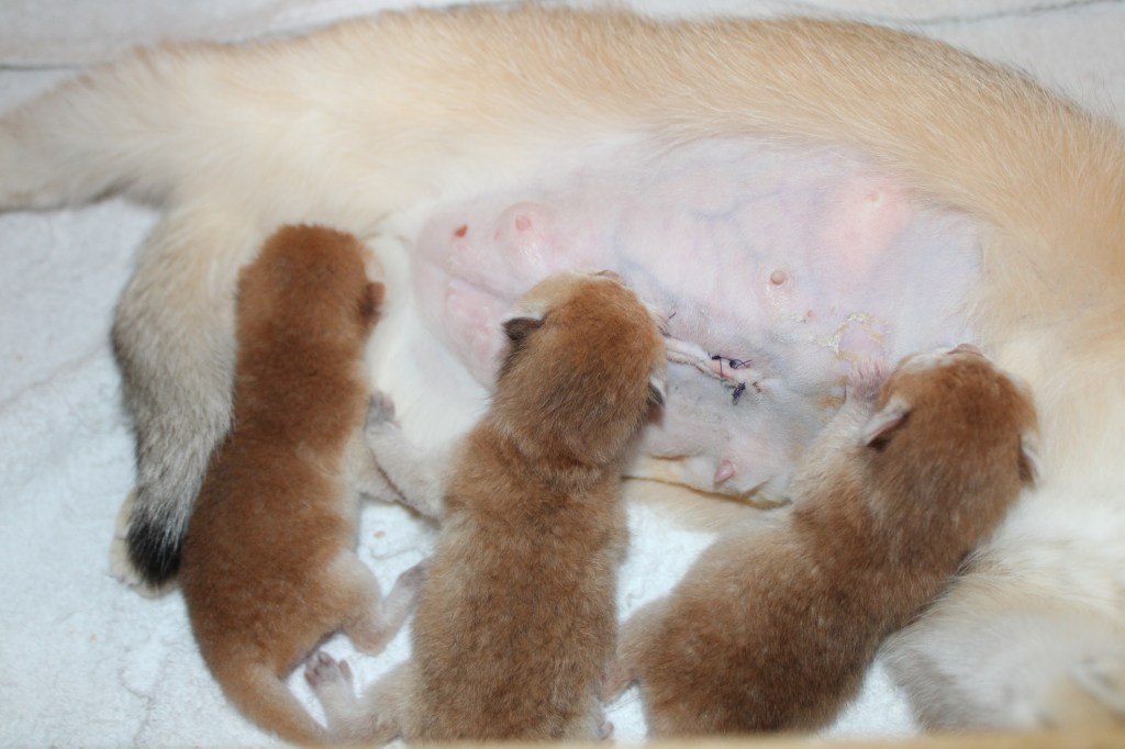 Vladys a mis bas ce lundi, malheureusement elle est partie en césarienne et nous avons perdu un chaton sur la portée mais les trois autres petits renards se portent bien.